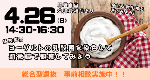 4/26(日)PM★来校型★【体験実習:身近な微生物を見てみよう!】総合型選抜《入試相談受付中‼》