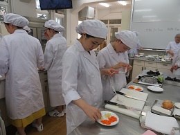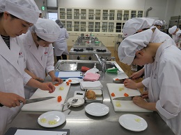 15回目の「子どもと食育」コースの取り組みを紹介します。保育園栄養士として活躍中の卒業生 唐澤葵さん((株)ポピンズNicot井荻勤務)から離乳食づくりのポイント、初期・中期・後期それぞれの野菜の大きさとやわらかさ等教えていただき、各自で野菜の切り方、加熱調理後、子どもにふさわしい形態をどのように確認していくのかまで実習しました。始めて乳児が口にするもの。。。を作る責任と喜びを体験した90分でした。