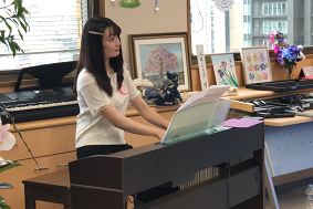 プログラム内容は、ペープサート「七夕劇」と、「見上げてごらん夜の星を」、「瑠璃色の地球」、「花の街」、「夏の思い出」、「この道」、「赤とんぼ」、「遥かな友に」をトーンチャイム、二部合唱で演奏しました。