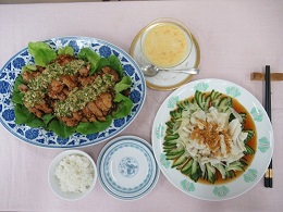 姜汁墨魚片はイカを飾り切りし、胡瓜、セロリとともに盛り付け生姜だれをかけたお料理です。学生たちはイカを捌き、飾り切りをし見た目が美しくなるように丁寧に作業していました。