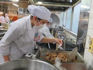 黒酢酢豚は旬のピーマン・赤パプリカを使用し、具材は一つひとつ油で揚げ、色よく仕上げました。豚肉もカリッと仕上げるだけではなく、中まで加熱されているか温度を計り、確認をしてから最後に調味料と合わせました。