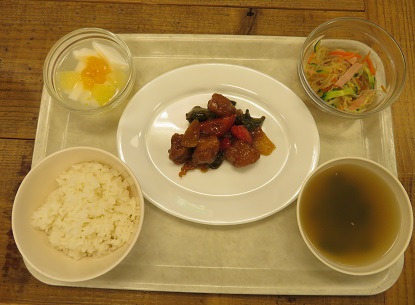 メニューは、ご飯・黒酢酢豚・春雨サラダ・わかめスープ・杏仁豆腐でした♪