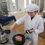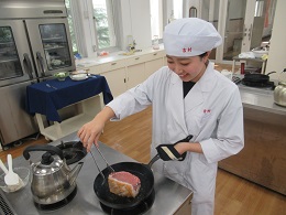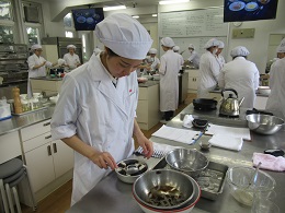 今回の実習は『コーンクリームスープ、ローストポーク、カッテージチーズのサラダ、マーブルゼリー』の4品を学びました。