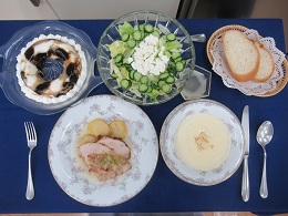 コーンクリームスープは、ミキサーにかけ丁寧に裏漉し滑らかなスープが出来ました。ローストポークは、塊の豚ロース肉をソテーしじゃが芋やベーコンと一緒にオーブンに30分以上入れます。カットしてお皿に盛るとおもてなしにぴったりの1品になります。デザートのマーブルゼリーはゼラチンの特性を活かしマーブル模様に仕上げました。