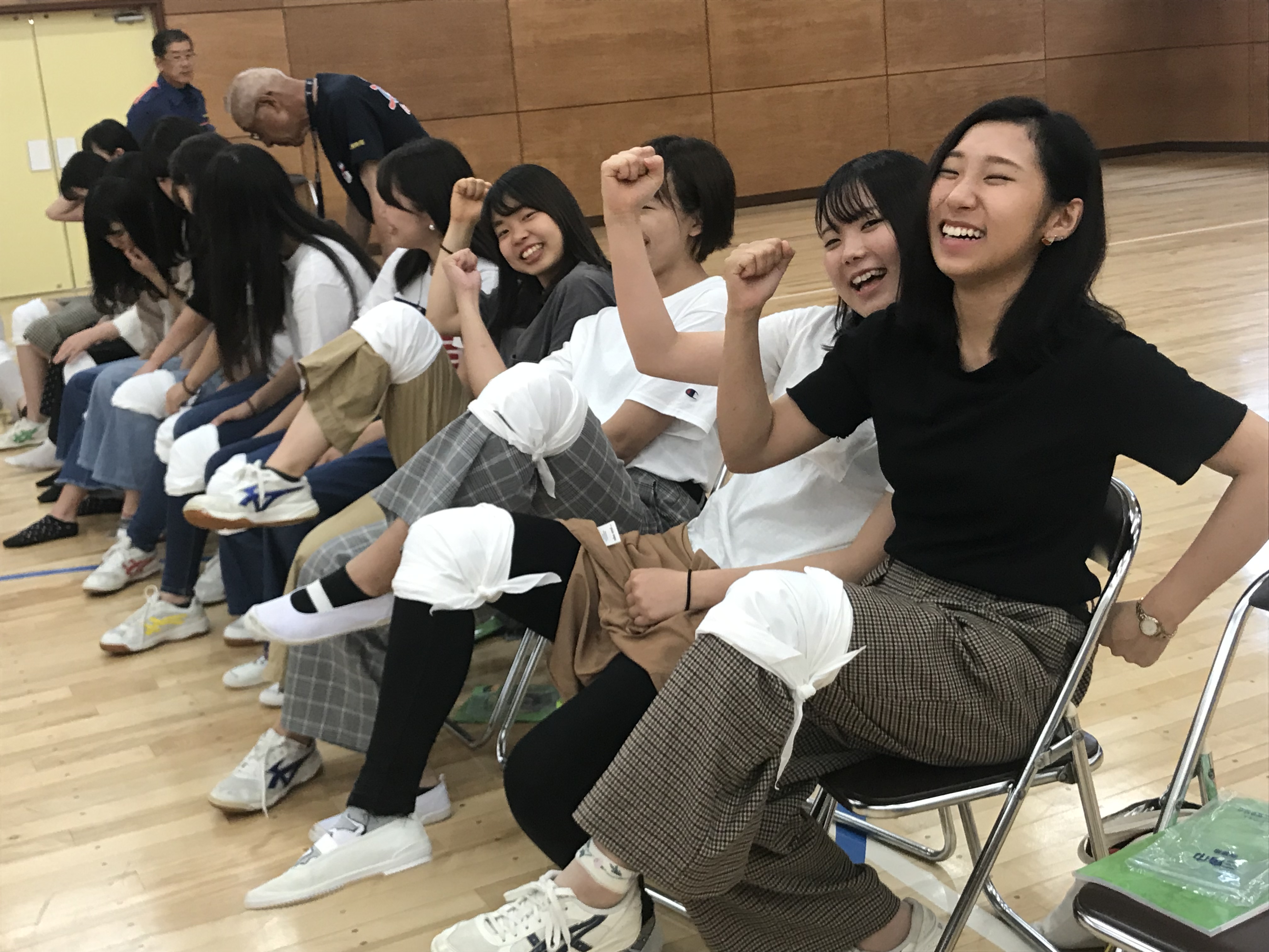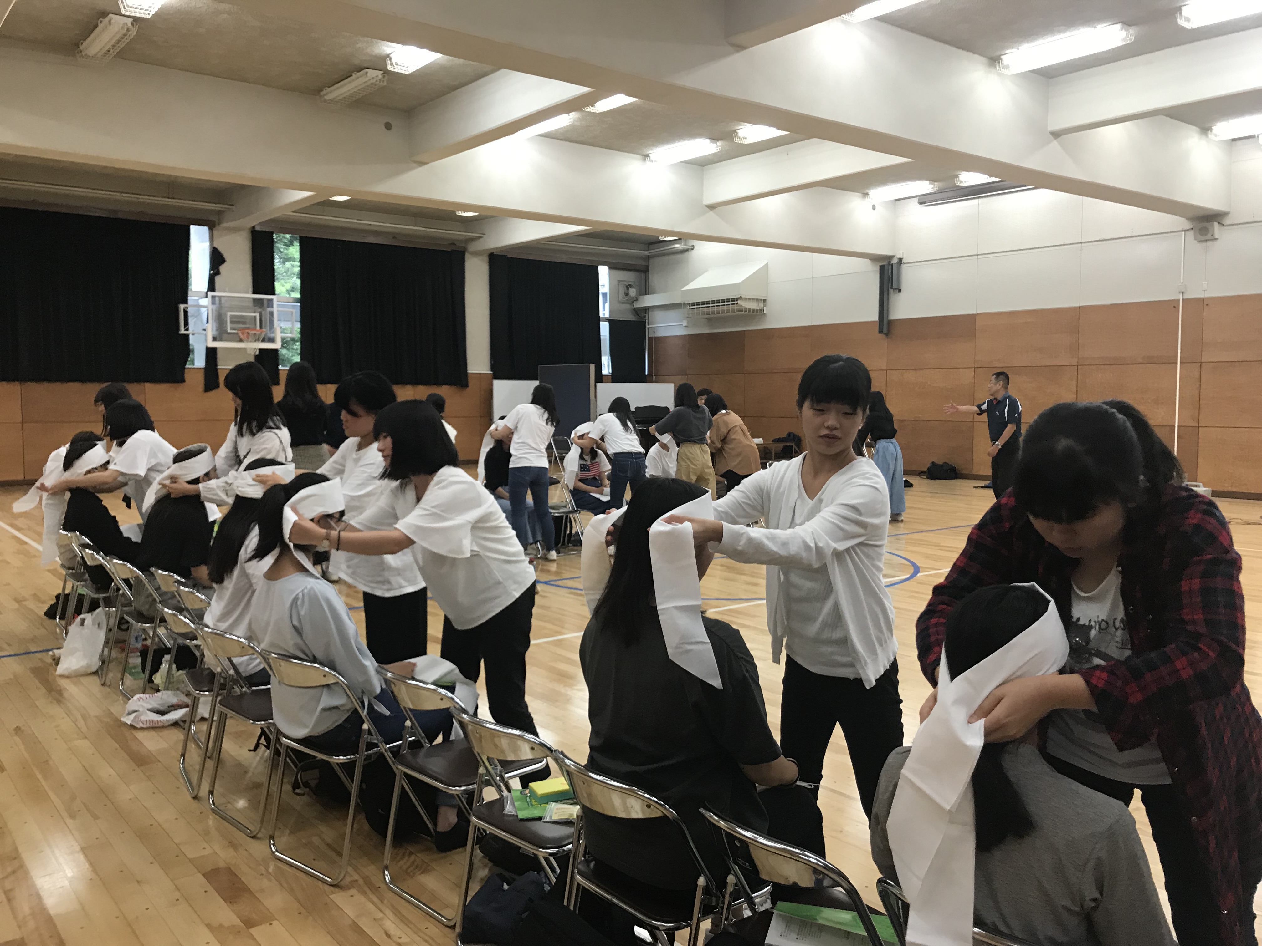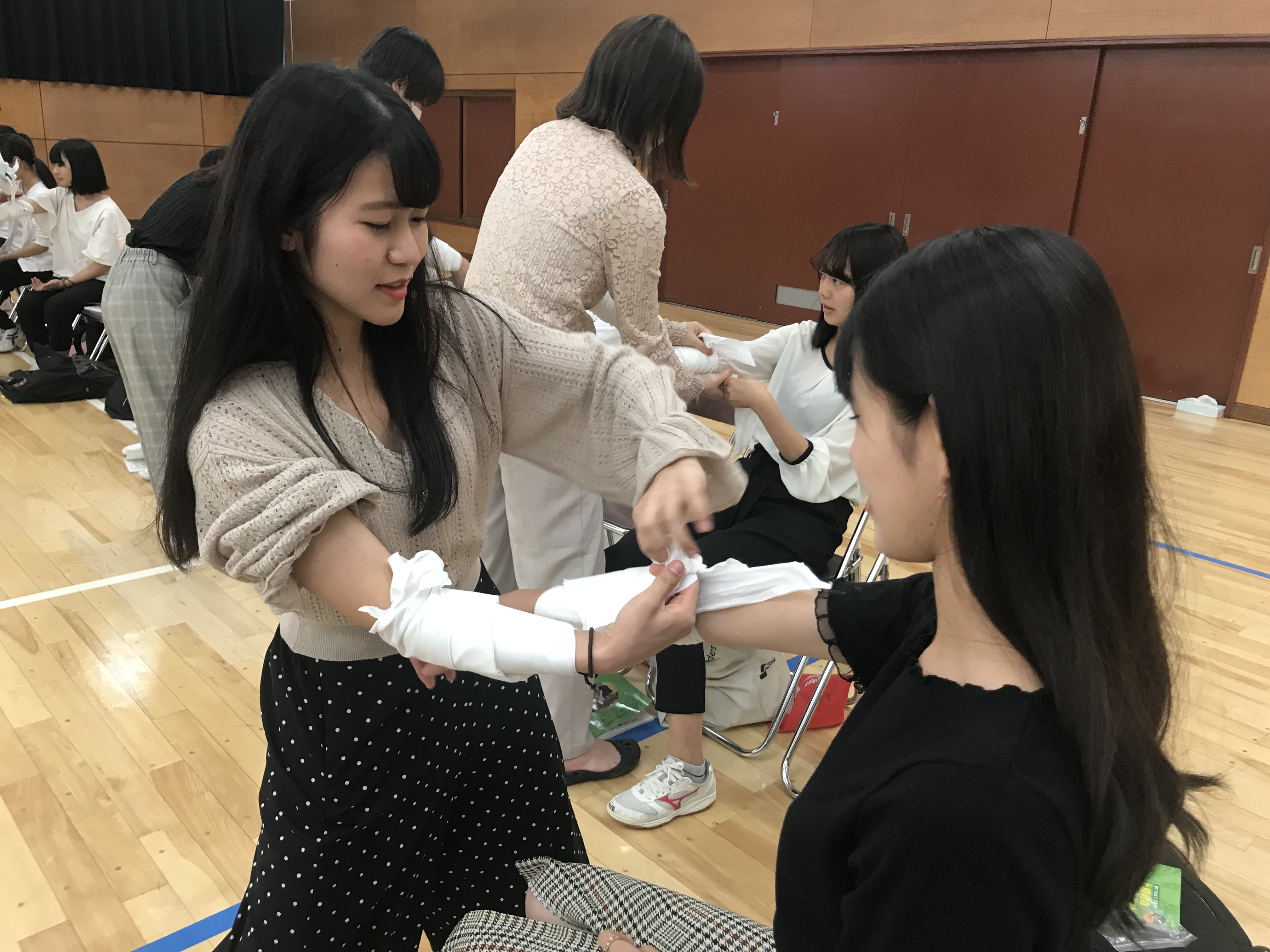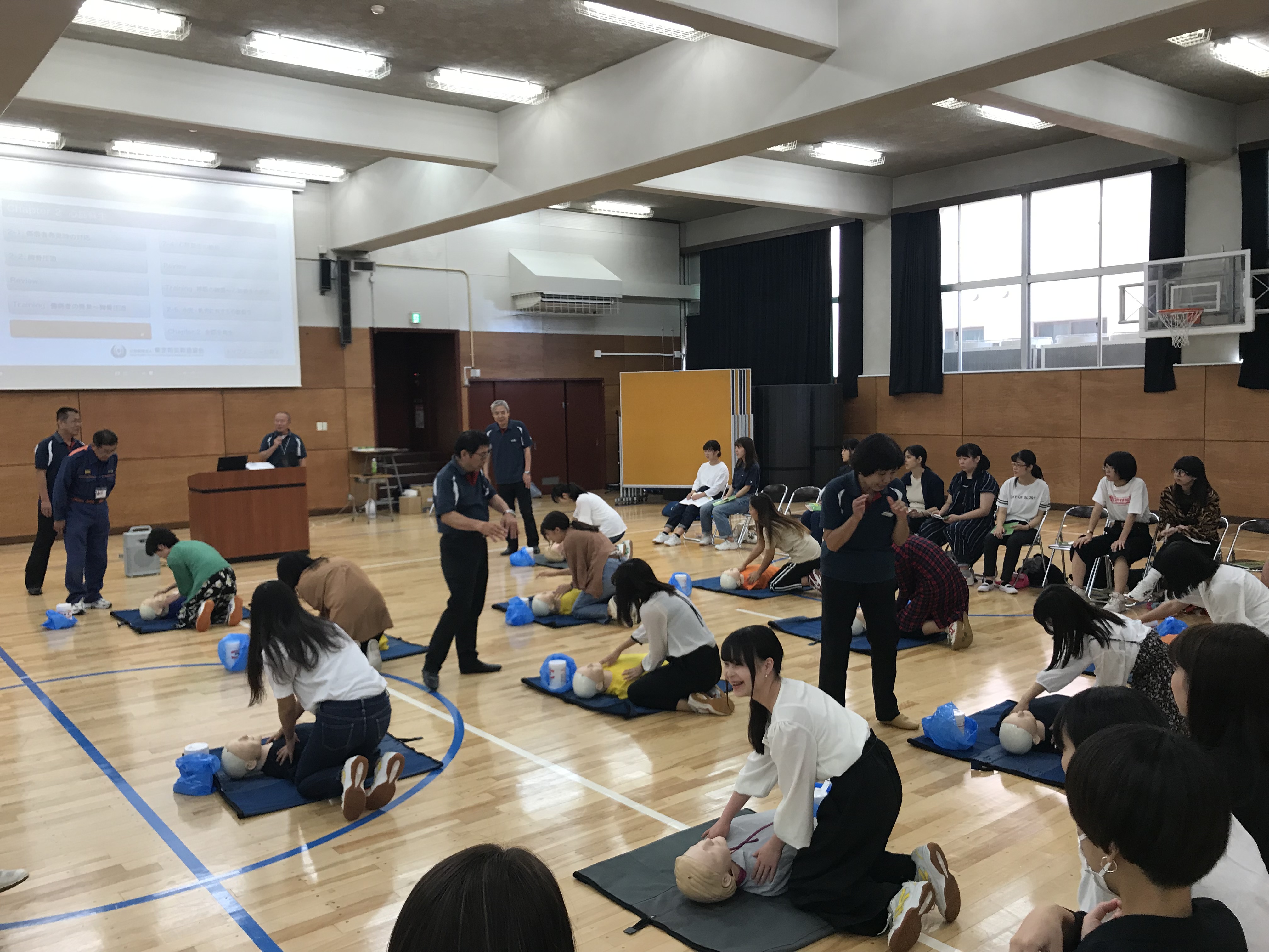 総勢44名の学生・教職員が参加し、8時間の講義・実技を通して、成人及び小児・乳児の救命処置、災害時を想定した応急処置や搬送の方法などを学びました。