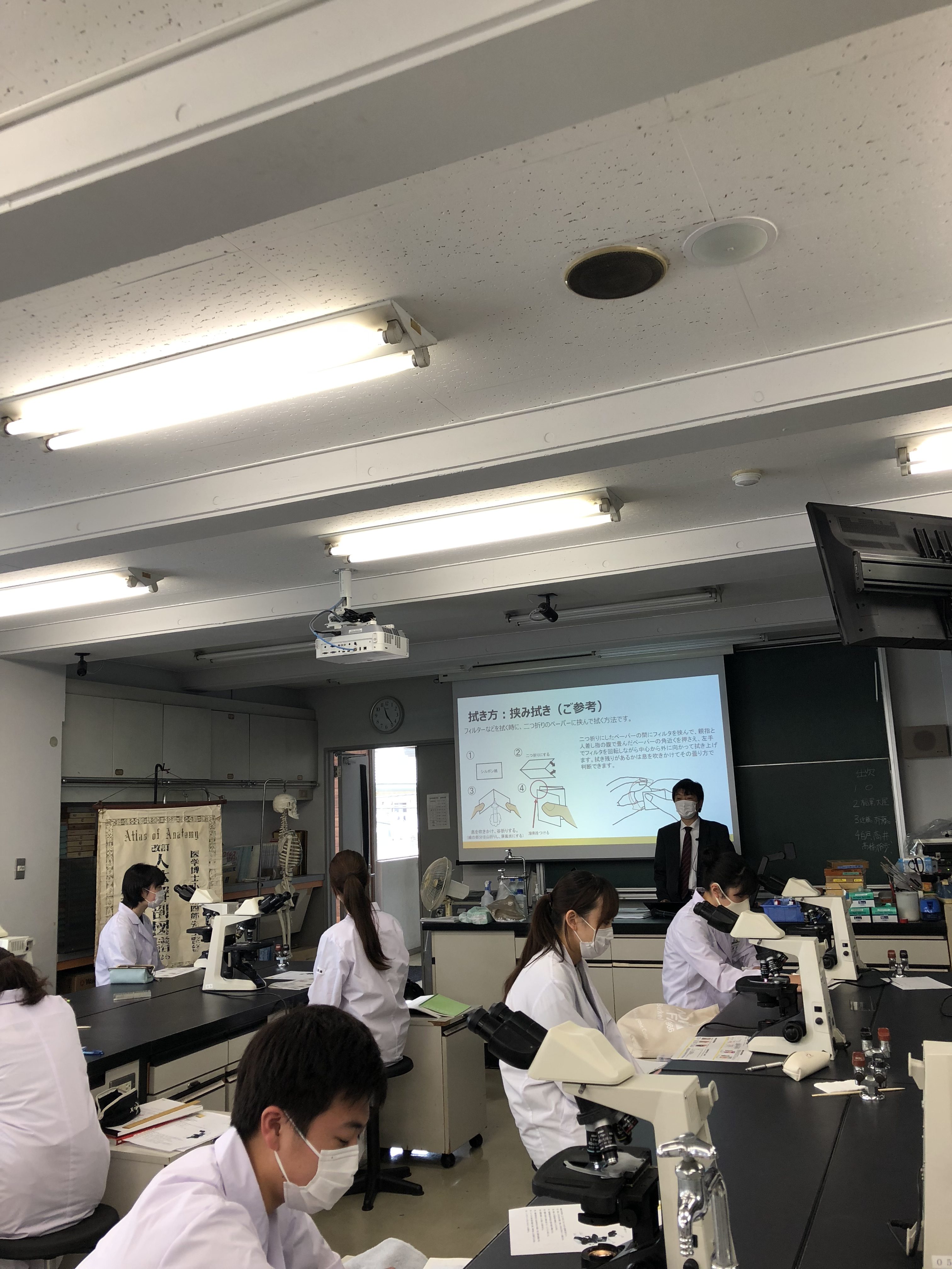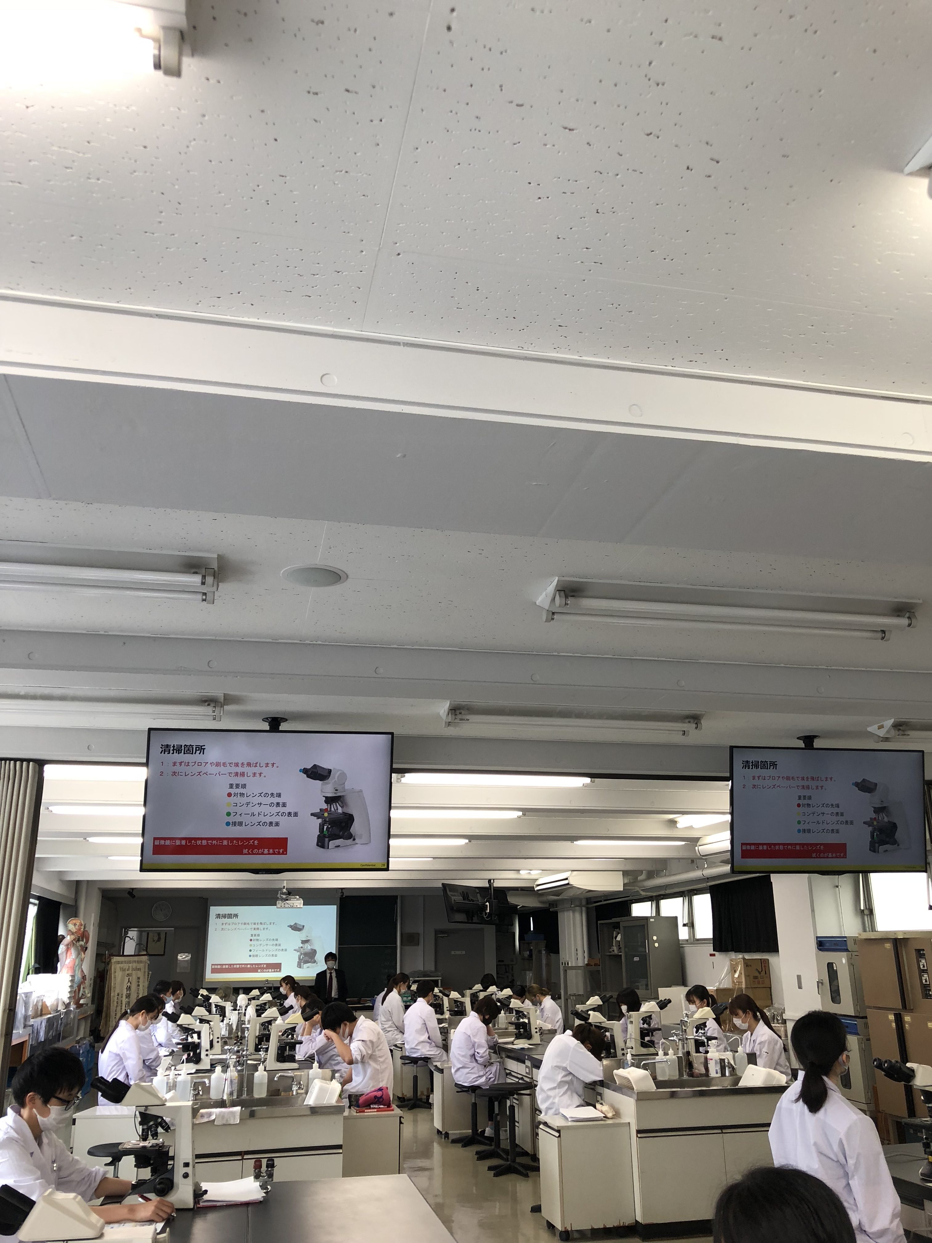 一人1台の顕微鏡を使い、密にならないように換気にも気を付けて実習を行っています。