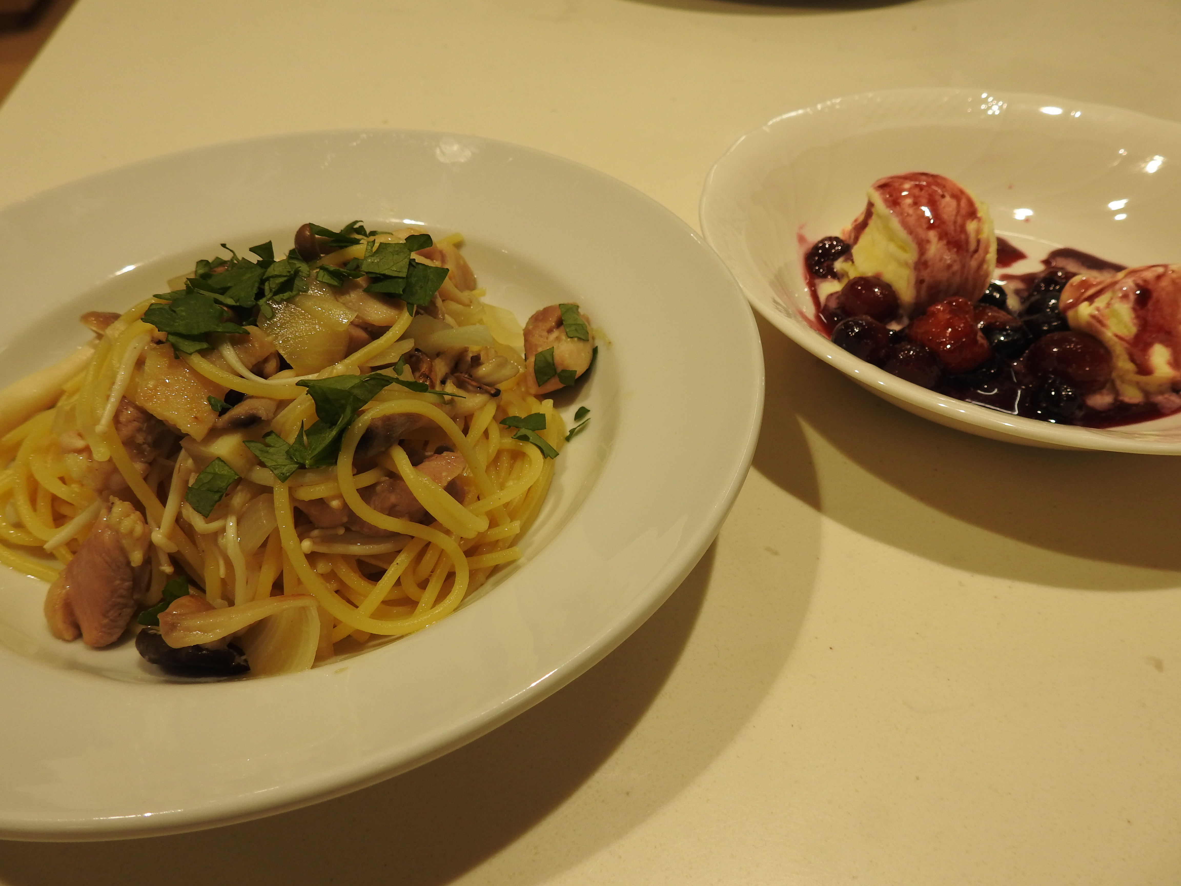 冬のパスタレッスンと題して、「5種のきのことチキンのスパゲティ」「ホットベリーソースのバニラアイス ぞえ 」
