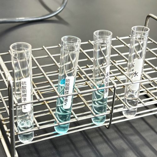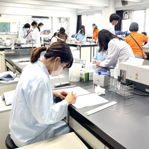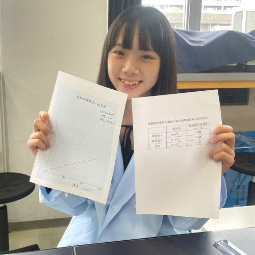 体験学習では「検査の基本 分光光度計を使ってみよう」を実施し、臨床検査技師にとって基本となる分析装置を操作して、測定した濃度から検量線を作成しました。