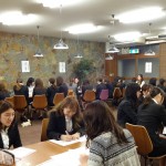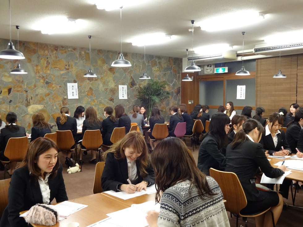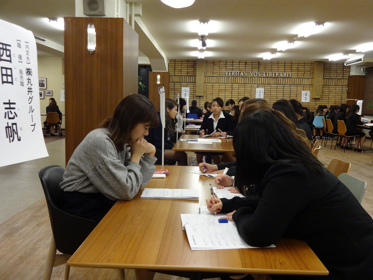 キャリアサポートセンターでは12月22日に学内のカフェテリアにて、「先輩たちの進路選択~内定者座談会」を開催しました。これから就職活動や編入学試験に向けてどのようにしたらいいか迷っている後輩に向けて、身近な先輩方のアドバイスをブースで直接聞ける機会ということもあり、人気の企画となっています。E.O