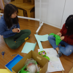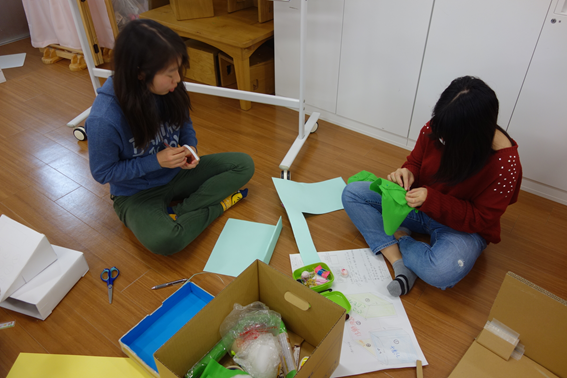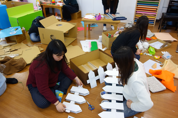 教職実践演習の授業では、幼稚園で子どもが「遊べる、楽しめる」教材の製作に取り組みました。