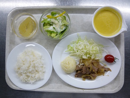 ライス・パンプキンスープ・テリヤキポーク、マッシュポテト・シーザーサラダ・りんごのコンポート