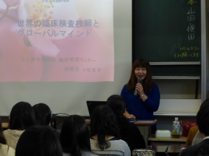 本日(午前)は3年生の特別講義に、国際臨床検査技師連盟会長で、がん研有明病院臨床病理センター技師長でもある小松京子先生が来校され、『世界の臨床検査技師とグローバルマインド』について講義して頂きました。国際臨床検査技師連盟の活動を知ることができ、また視野の広いもののとらえ方、今後の臨床検査技師人生をどのように設計していくか(目的や動機づけ)、就職に関する内容など学生にとって為になるお話を多岐にわたりして頂きました。SN
