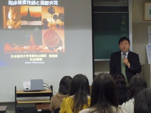 2013.11.22 特別講義3 ブログ ホームキャンパスブログブログ特別講義3 本日は3年生の特別講義に、日本医科大学附属永山病院病理部技師長の片山博徳先生が来校され、『臨床検査技師と国際交流』について講義して頂きました。国際交流については特にアジア地域での活動についてお話頂きました。SN 前の記事へ保育実習室はミニ作品展会場 次の記事へ第15回オープンキャンパス Campus Blog同じカテゴリーの記事 2026.02.25 🔬臨床検査学科:フィギュアスケート大会「St. Valentine Cup」に、本学1年生の西島優香さんが出場しました⛸️✨ イベントサークルその他ブログ 臨床検査 2026.02.21 🔬臨床検査学科:2年生・技能修得達成度評価【患者接遇】 イベントブログ授業リポート 臨床検査 2026.02.21 フードデザイン学科:事務局メンバーがリクルート進学総研のインタビュー記事に掲載されました🎤 インタビューブログ 食物栄養学科・フードデザイン 2026.02.17 🔬臨床検査学科:2年生・技能修得達成度評価【病理検査学】 イベントその他ブログ授業リポート 臨床検査 2026.02.16 🔬臨床検査学科:国家試験がんばれ! イベントその他ブログ 臨床検査 2026.02.10 フードデザイン学科:入学予定者限定イベント『NITOBEキャンパスライフ先取りDAY』が行われました🌟 イベントブログ 食物栄養学科・フードデザイン 2026.02.07 フードデザイン学科:上級救命講習 開催 -命を守る力を、あなたの手に- イベントブログ 食物栄養学科・フードデザイン 2026.02.06 フードデザイン学科:卒業研究発表会 ~誰かの幸せにつながる「食」の研究~ イベントブログ授業リポート 食物栄養学科・フードデザイン