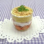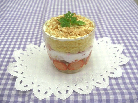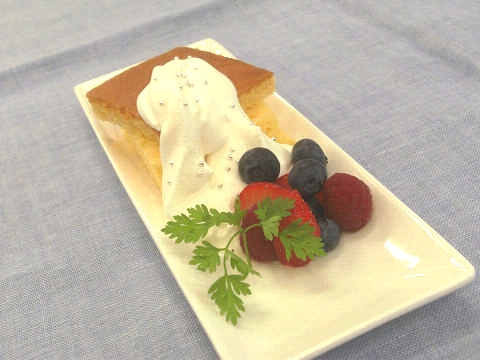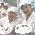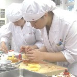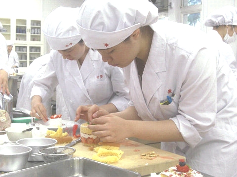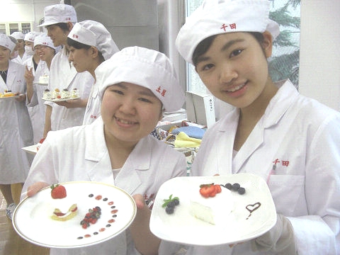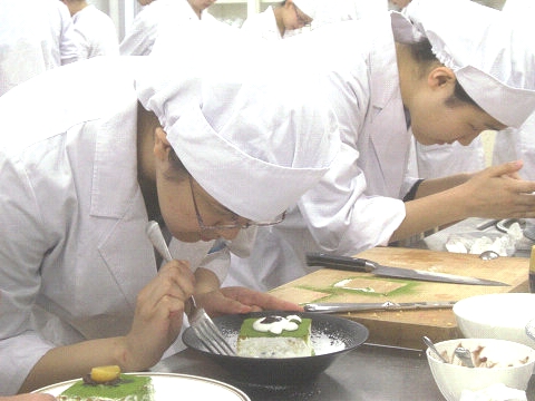 スポンジケーキ、生クリーム、フルーツ類、フレーク、チョコレート、ジャム、ソース、シロップ類、あずき、抹茶、ミント、チャーピルなど様々な材料の中からそれぞれに適した食材を選び、盛りつけの構造をイメージし、真剣に課題に取り組みました。