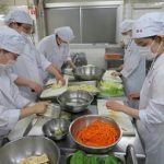 今日は2班DBクラスの初回でした!メニューは、ご飯、カニ玉の野菜あんかけ、春巻き、ほうれん草とトマトの中華スープ、マンゴーゼリーでした♪カニ玉は卵に入れる具材を炒めた後、冷ましてから卵液と混ぜ、焼いていきます。春巻も包む具材を炒めた後、冷ましてから包んでいくため、大急ぎで切りものをし、準備をしました。初回で慣れない中でしたが、回転釜で野菜たっぷりのあんかけを作り、春巻もぱりっと揚がりました♪お客様からは「お腹いっぱ~い!美味しかった~!」との声もあり、実習の学生は嬉しそうに大きな声で「ありがとうございました」とお客様にお礼を伝えていました。M.N
