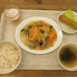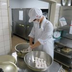 今日は2班DBクラスの初回でした!メニューは、ご飯、カニ玉の野菜あんかけ、春巻き、ほうれん草とトマトの中華スープ、マンゴーゼリーでした♪カニ玉は卵に入れる具材を炒めた後、冷ましてから卵液と混ぜ、焼いていきます。春巻も包む具材を炒めた後、冷ましてから包んでいくため、大急ぎで切りものをし、準備をしました。初回で慣れない中でしたが、回転釜で野菜たっぷりのあんかけを作り、春巻もぱりっと揚がりました♪お客様からは「お腹いっぱ~い!美味しかった~!」との声もあり、実習の学生は嬉しそうに大きな声で「ありがとうございました」とお客様にお礼を伝えていました。M.N