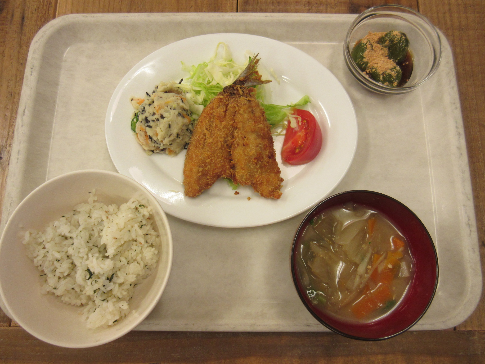 メニューは、青じそご飯、あじフライ、和風ポテトサラダ、根菜のみそ汁、抹茶白玉~黒みつ・きなこがけ~でした♪