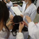 写真は、被検者の頭をメジャーで測っているところ。人によって頭の形が異なるので大変です。