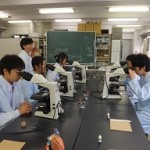 本学では臨床検査技師の仕事を体験してもらおうと、顕微鏡を用いて、自分の頬の内側の粘膜などを観察してもらいました。