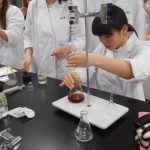 食物栄養専攻1年生対象科目の「食品学実験」は、食品学総論で学んでいる各種栄養素の構造およびその性質に関する理論について身近な食材を試料として検証を行うことを目的としています。