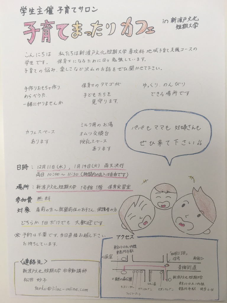 2020.01.17 【専攻科】子育てまったりカフェ ブログ 児童生活 ホームキャンパスブログブログ【専攻科】子育てまったりカフェ 専攻科「地域子育て支援コース」による子育てサロンを開催しました。 ゆったりまったり賑やかな雰囲気で1時間半を過ごしました。 赤ちゃんの声が響く中、おやつを食べたりおんぶのコツをお話ししたりしました。 コースの学生が大活躍する一日でした! 前の記事へ認知症サポーター養成講座を開催しました。 次の記事へ中野区長が授業に参加?! Campus Blog同じカテゴリーの記事 2026.02.25 🔬臨床検査学科:フィギュアスケート大会「St. Valentine Cup」に、本学1年生の西島優香さんが出場しました⛸️✨ イベントサークルその他ブログ 臨床検査 2026.02.21 🔬臨床検査学科:2年生・技能修得達成度評価【患者接遇】 イベントブログ授業リポート 臨床検査 2026.02.21 フードデザイン学科:事務局メンバーがリクルート進学総研のインタビュー記事に掲載されました🎤 インタビューブログ 食物栄養学科・フードデザイン 2026.02.17 🔬臨床検査学科:2年生・技能修得達成度評価【病理検査学】 イベントその他ブログ授業リポート 臨床検査 2026.02.16 🔬臨床検査学科:国家試験がんばれ! イベントその他ブログ 臨床検査 2026.02.10 フードデザイン学科:入学予定者限定イベント『NITOBEキャンパスライフ先取りDAY』が行われました🌟 イベントブログ 食物栄養学科・フードデザイン 2026.02.07 フードデザイン学科:上級救命講習 開催 -命を守る力を、あなたの手に- イベントブログ 食物栄養学科・フードデザイン 2026.02.06 フードデザイン学科:卒業研究発表会 ~誰かの幸せにつながる「食」の研究~ イベントブログ授業リポート 食物栄養学科・フードデザイン