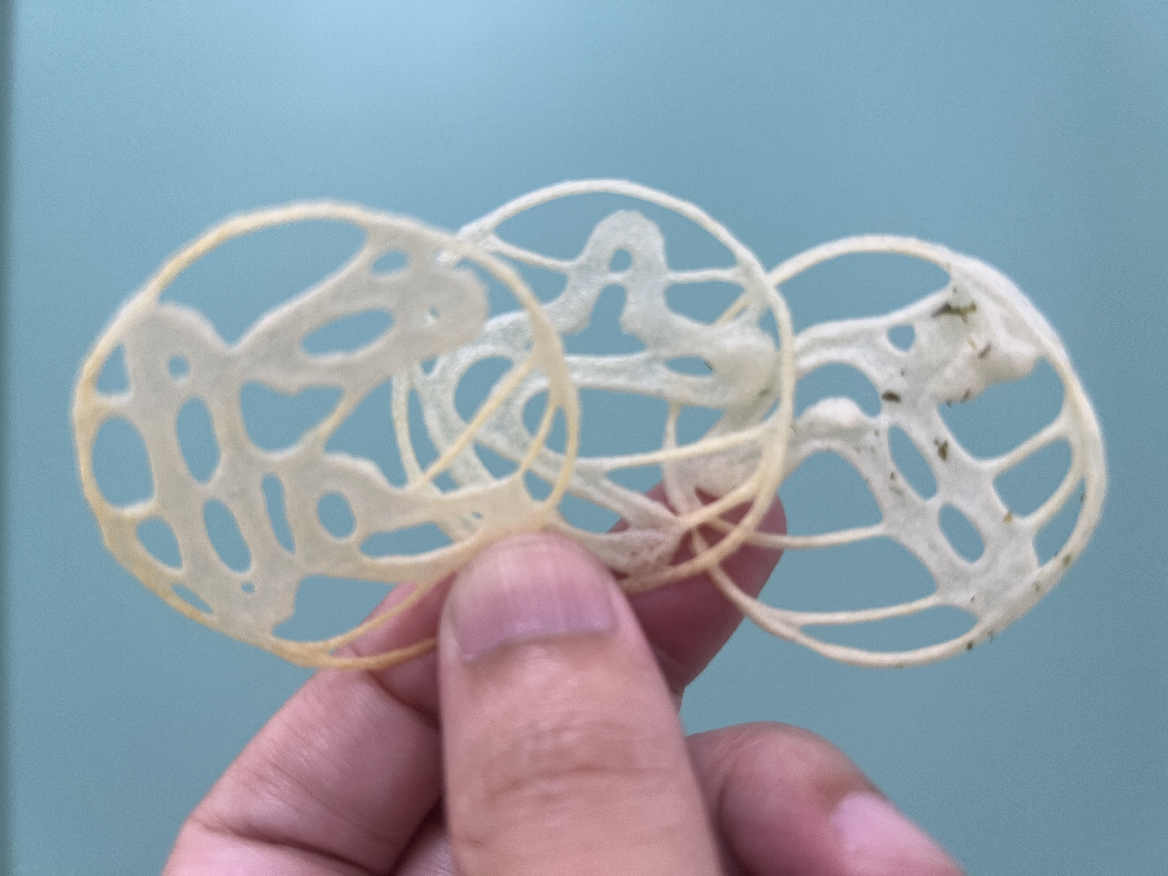↑ 3Dフードプリンターで作った に・と・べ 文字のポテトチップスは美味しかった!