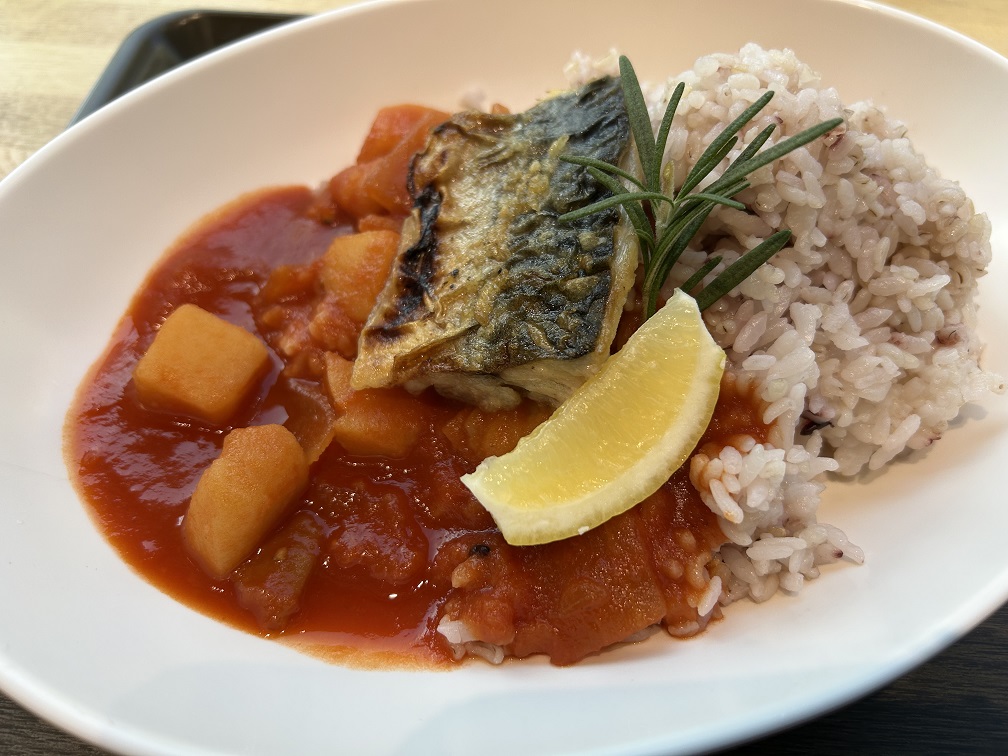 早速、本学の学生が考案した「情熱の!!カバァリャーコントマテ(サバのトマト煮)」を食べてきました。
