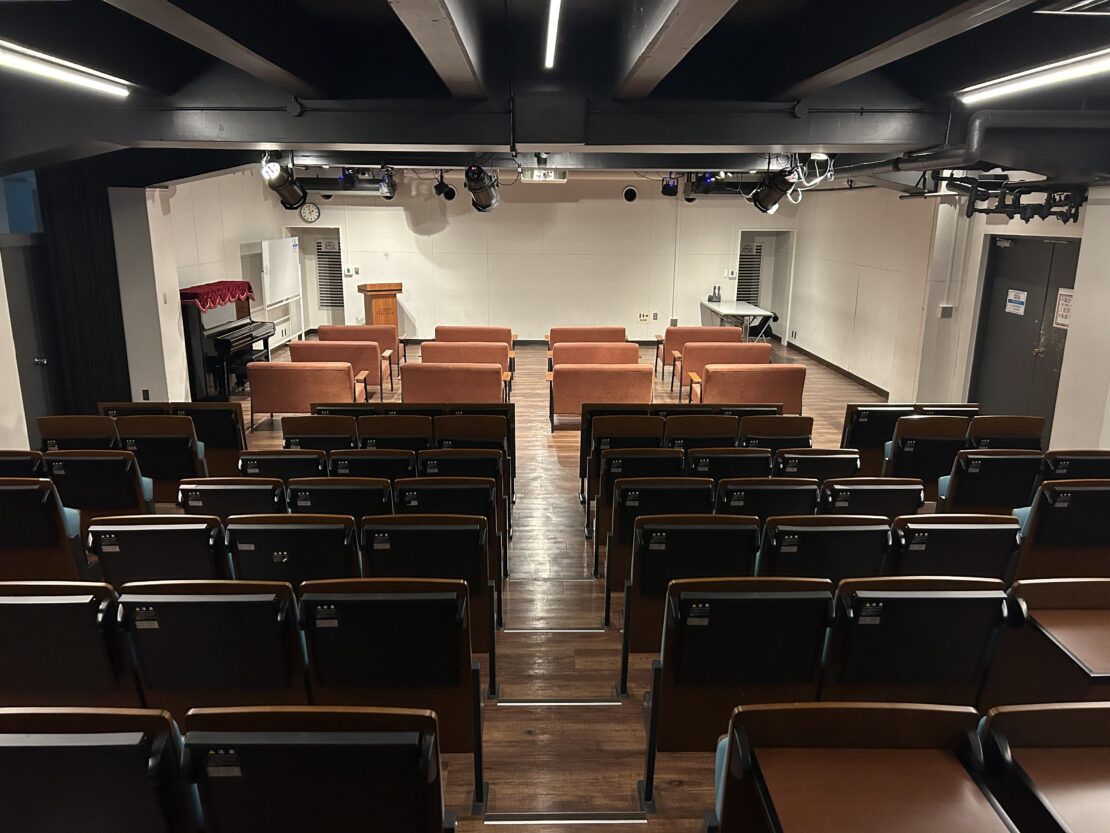 映画館のような大画面スクリーンを保有するホール。授業はもちろん外部向けの説明会でも使用します。