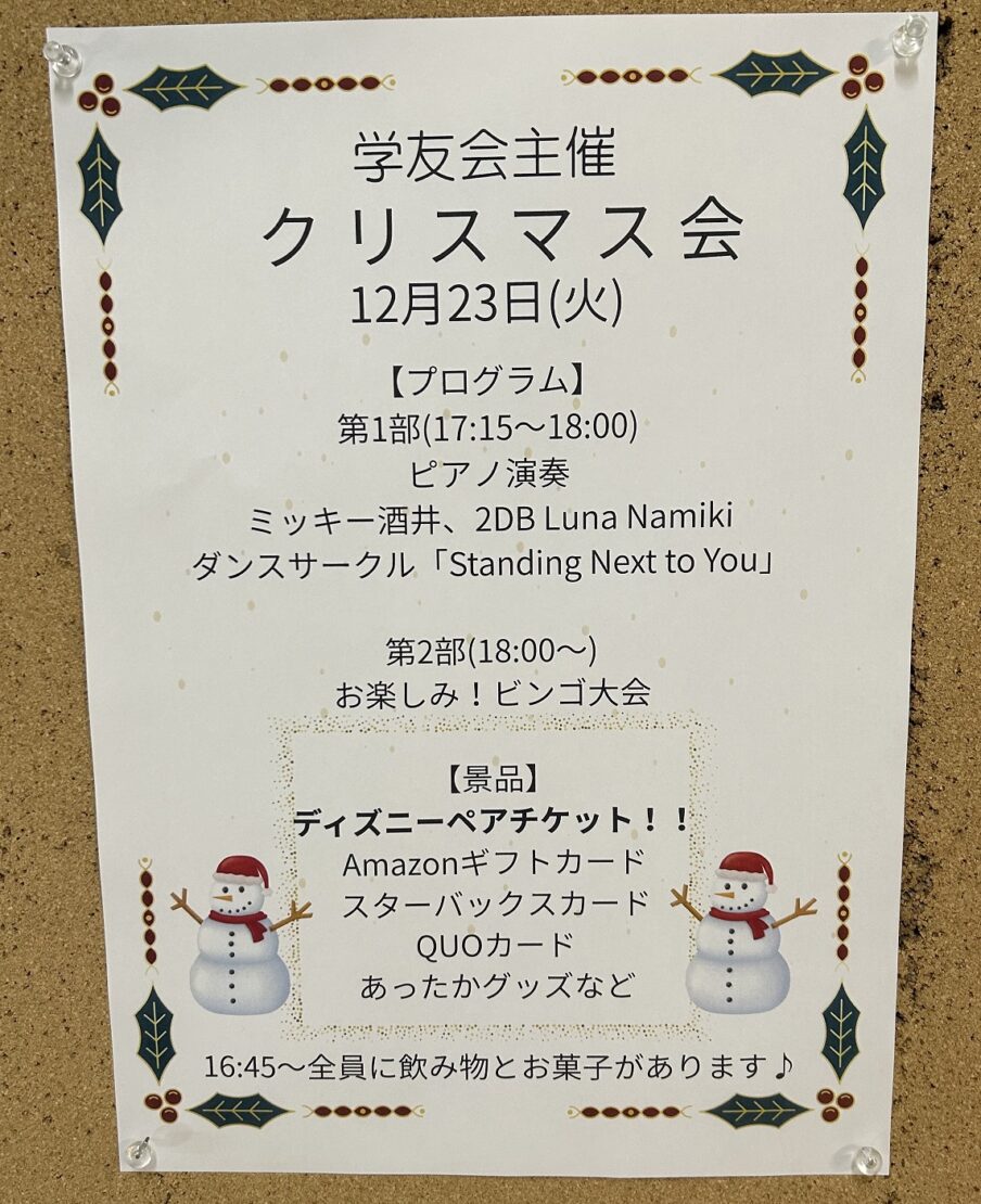 2025年12月23日(火)17時15分からNITOBE THEAERにて学友会主催のクリスマス会が開催されました。