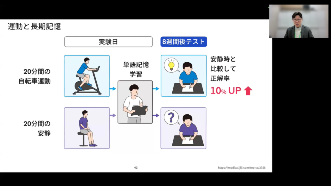 軽度の運動(20分間の自転車運動)を行っただけで、記憶テストの結果に10%の差が出たそうです。