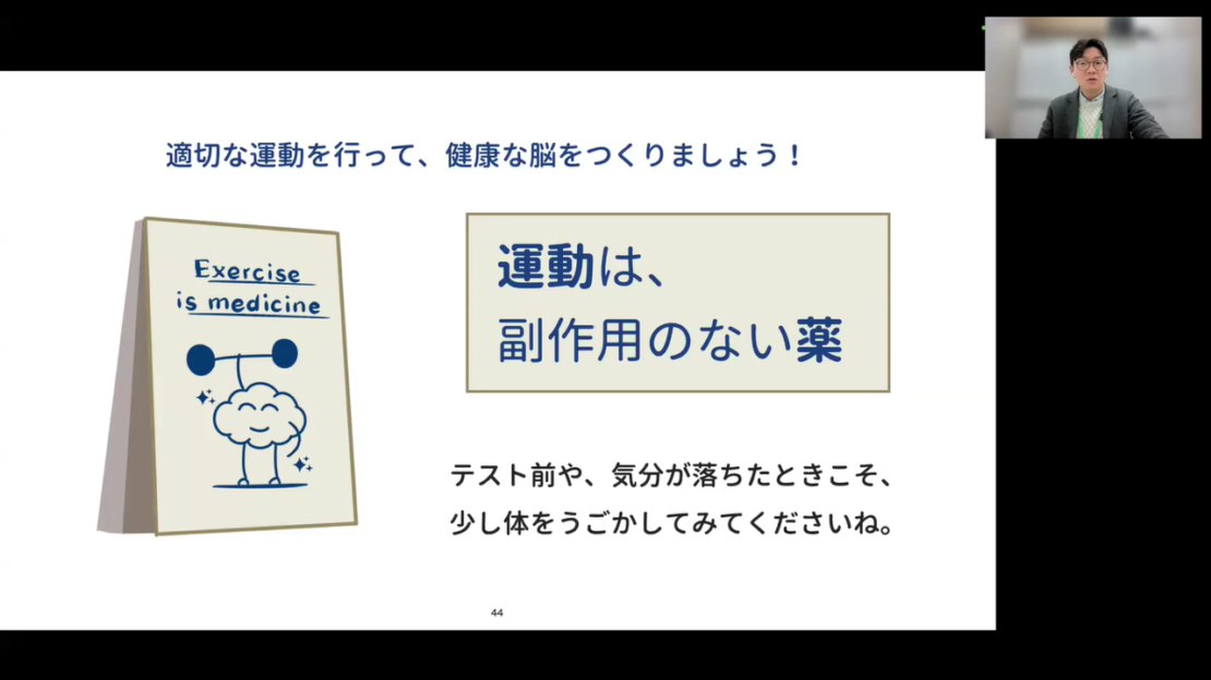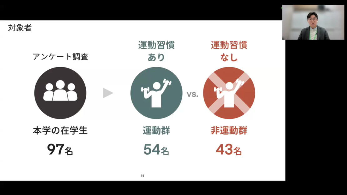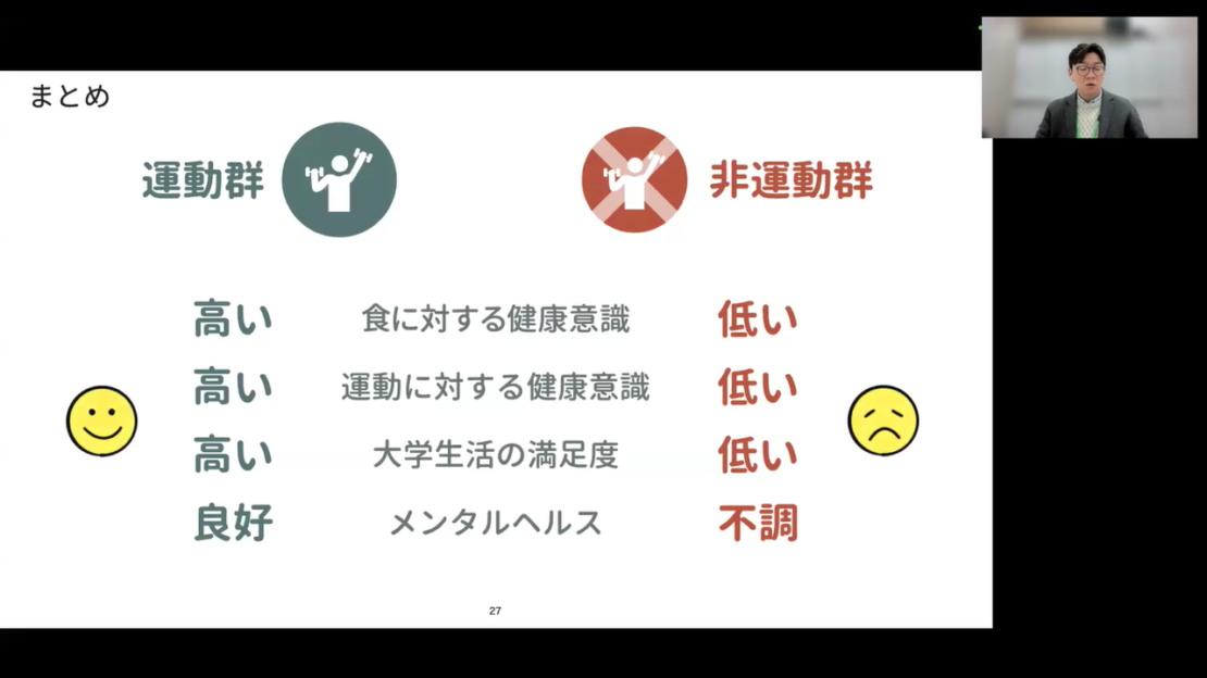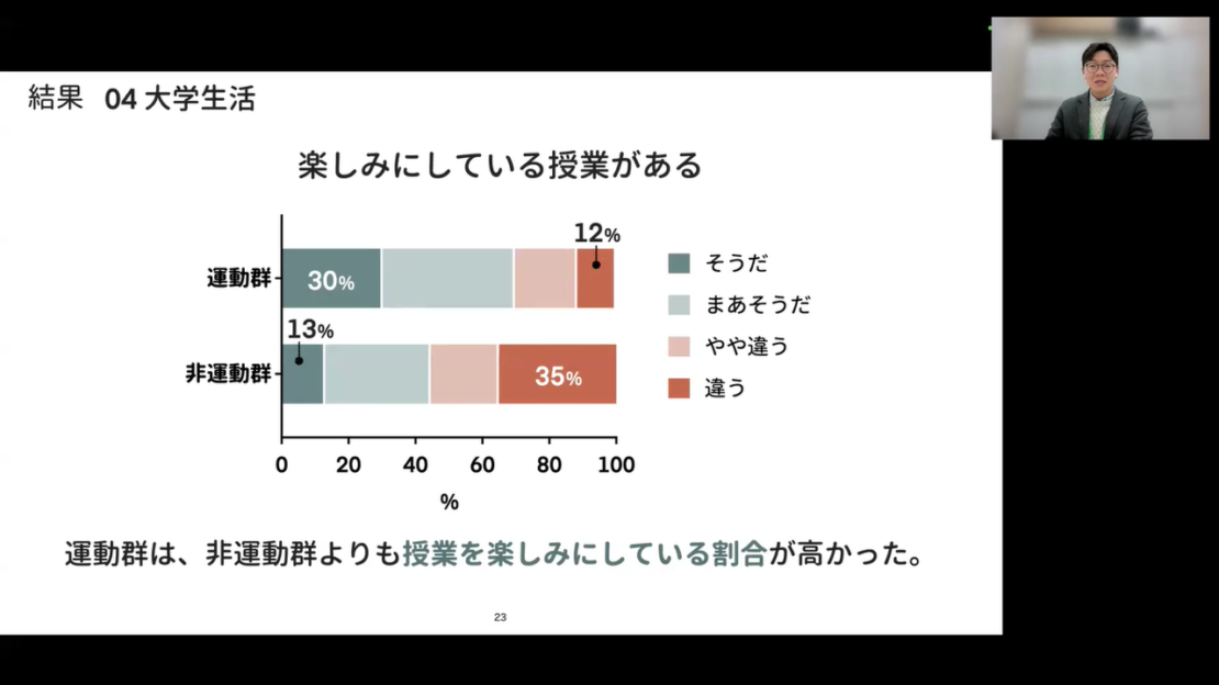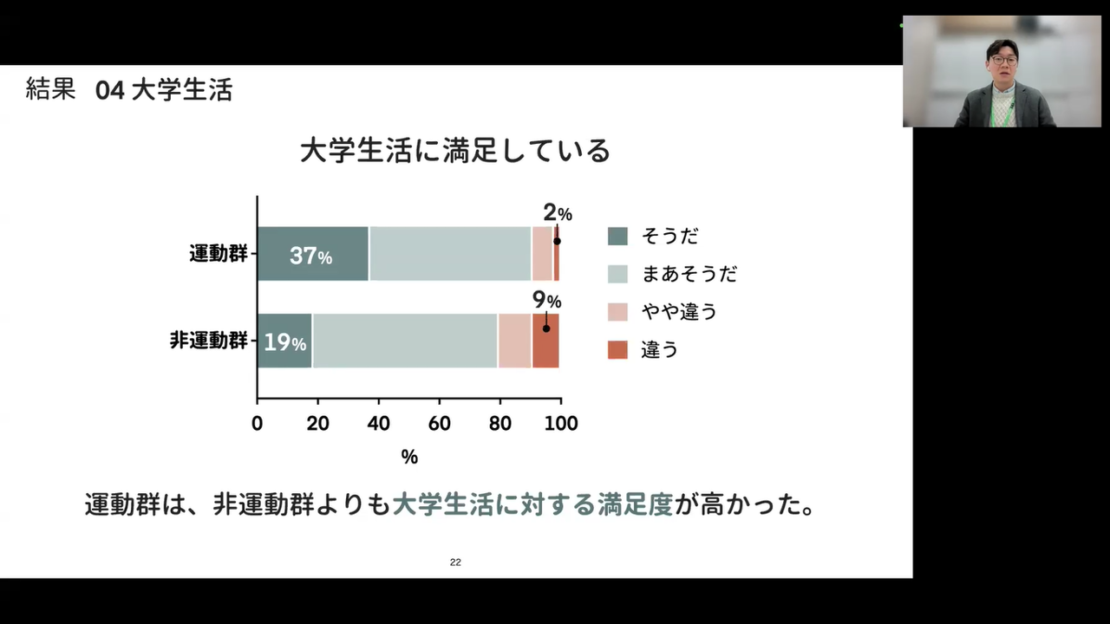 運動習慣を身につけることによって、より充実した大学生活を送れる可能性が伺えます。