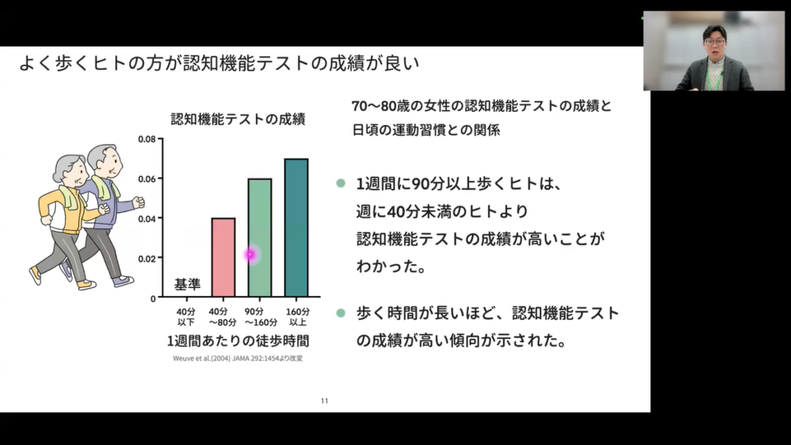 よく歩く人とそうではない人を比較すると、よく歩く人の方が死亡リスクが減り、認知症テストの結果が良いことが分かります。