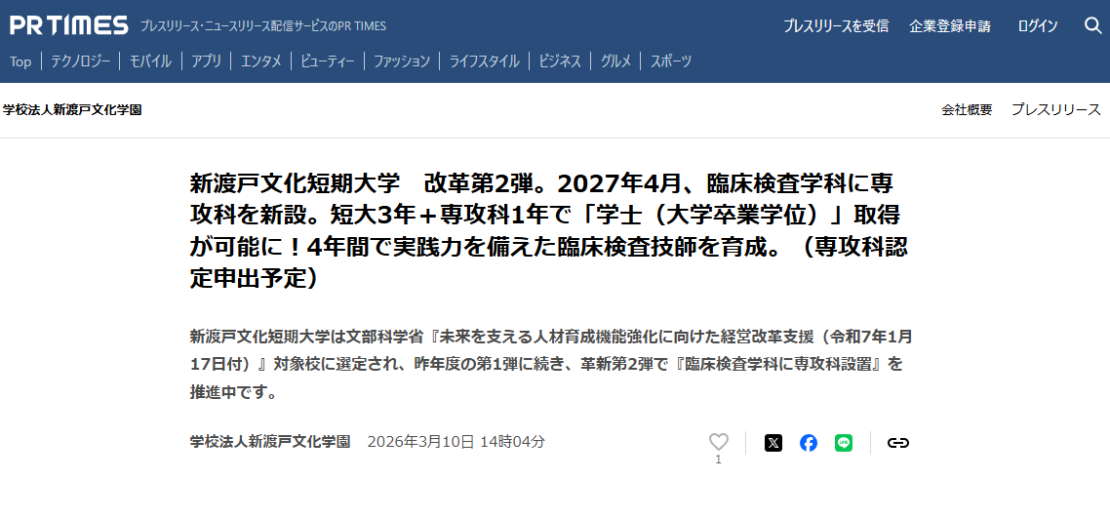このたび、新渡戸文化短期大学では、PR TIMESにてプレスリリースをいたしました。