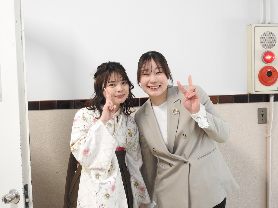 在校生も、先輩方の門出を笑顔で祝福していました。 さらに、昨年の卒業生も祝福に駆けつけてくれました。その温かなエールが世代を超えたつながりを感じさせ、会場にはあたたかな雰囲気が広がっていました。