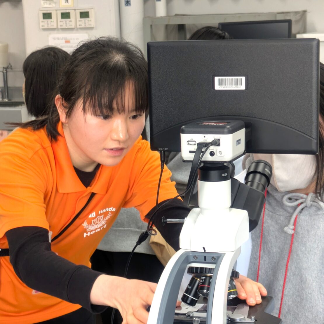 体験実習では「双眼顕微鏡を操作して白血球を観察しよう!」をテーマに、「好中球」を探していただきました。ほかの末梢血中の細胞にも興味を持ってくださり、熱心に顕微鏡観察をされている様子が見られました。