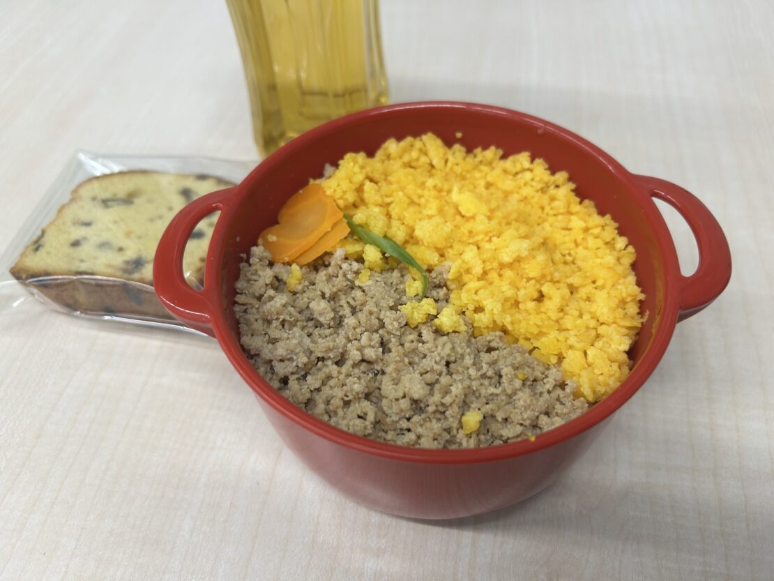 鳥そぼろと卵のキレイなコントラスト。見た目以上にボリューム満点です。