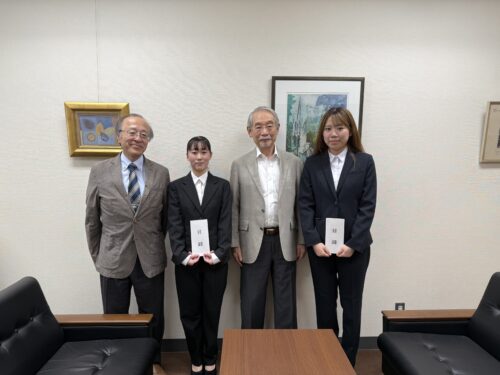 授賞式では、宮地学長も学生のそばに寄り添い、第六代学園理事長の豊川圭一前理事長より認定証が授与され、